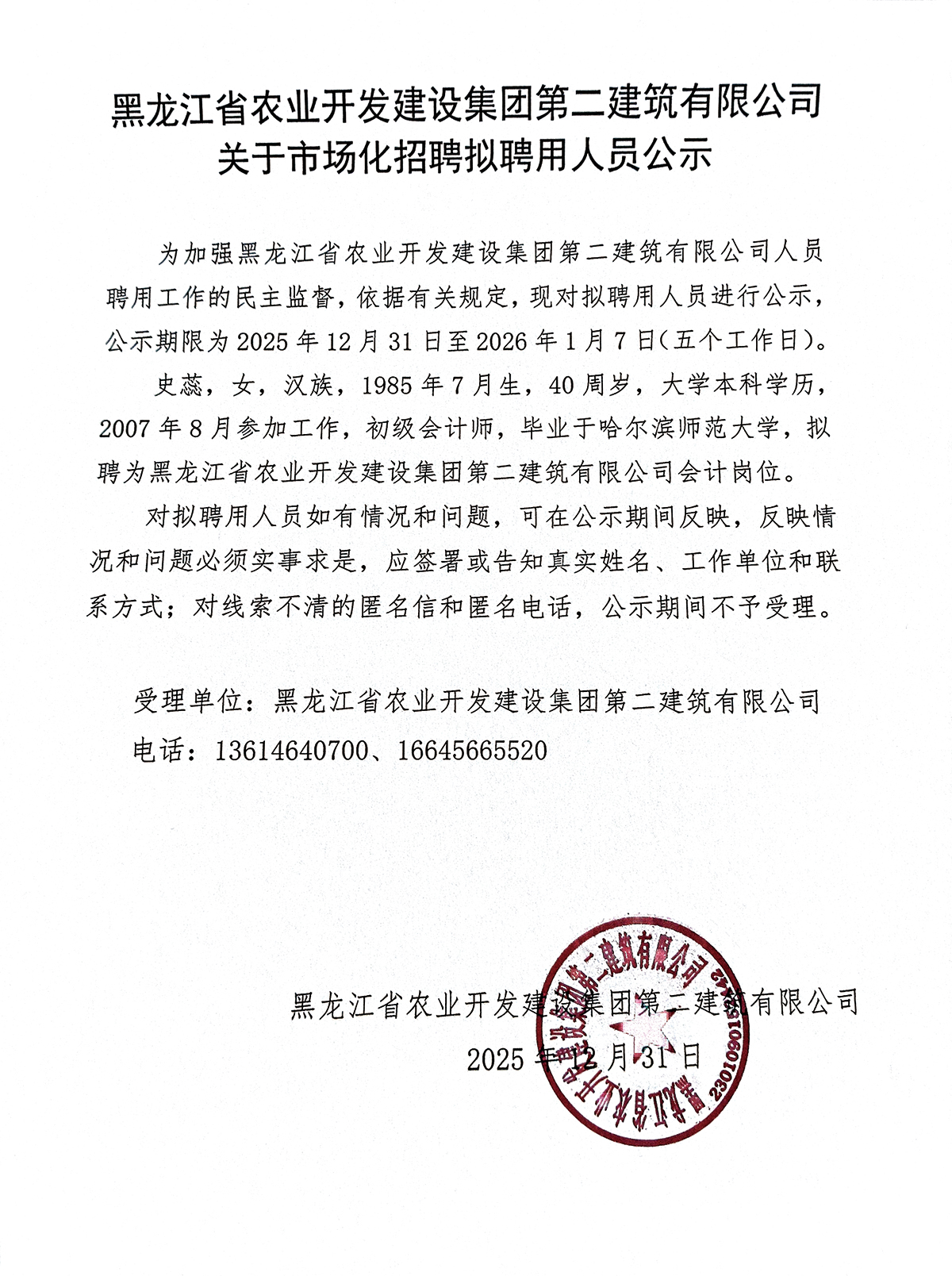 黑龙江省农业开发建设集团第二建筑有限公司关于市场化招聘拟聘用人员公示