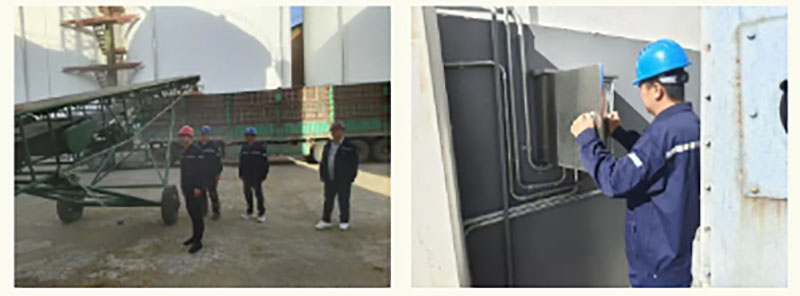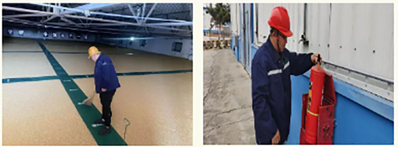保管员清扫粮面卫生确保粮仓内干净                                 安全保卫部员工检查灭火器