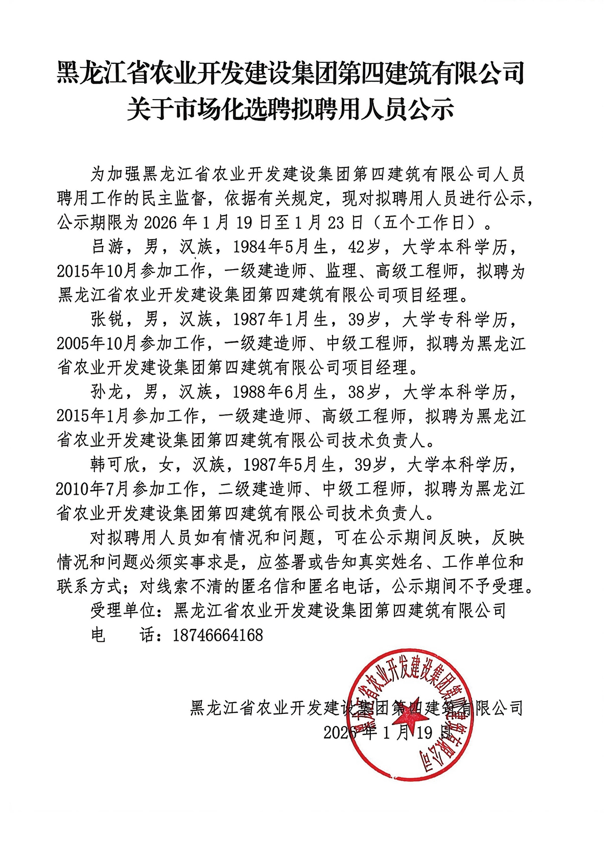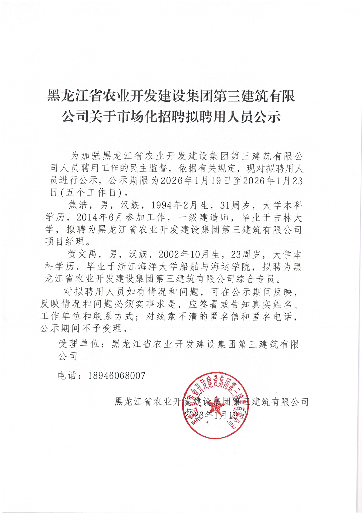 黑龙江省农业开发建设集团权属企业关于市场化选聘拟聘用人员公示