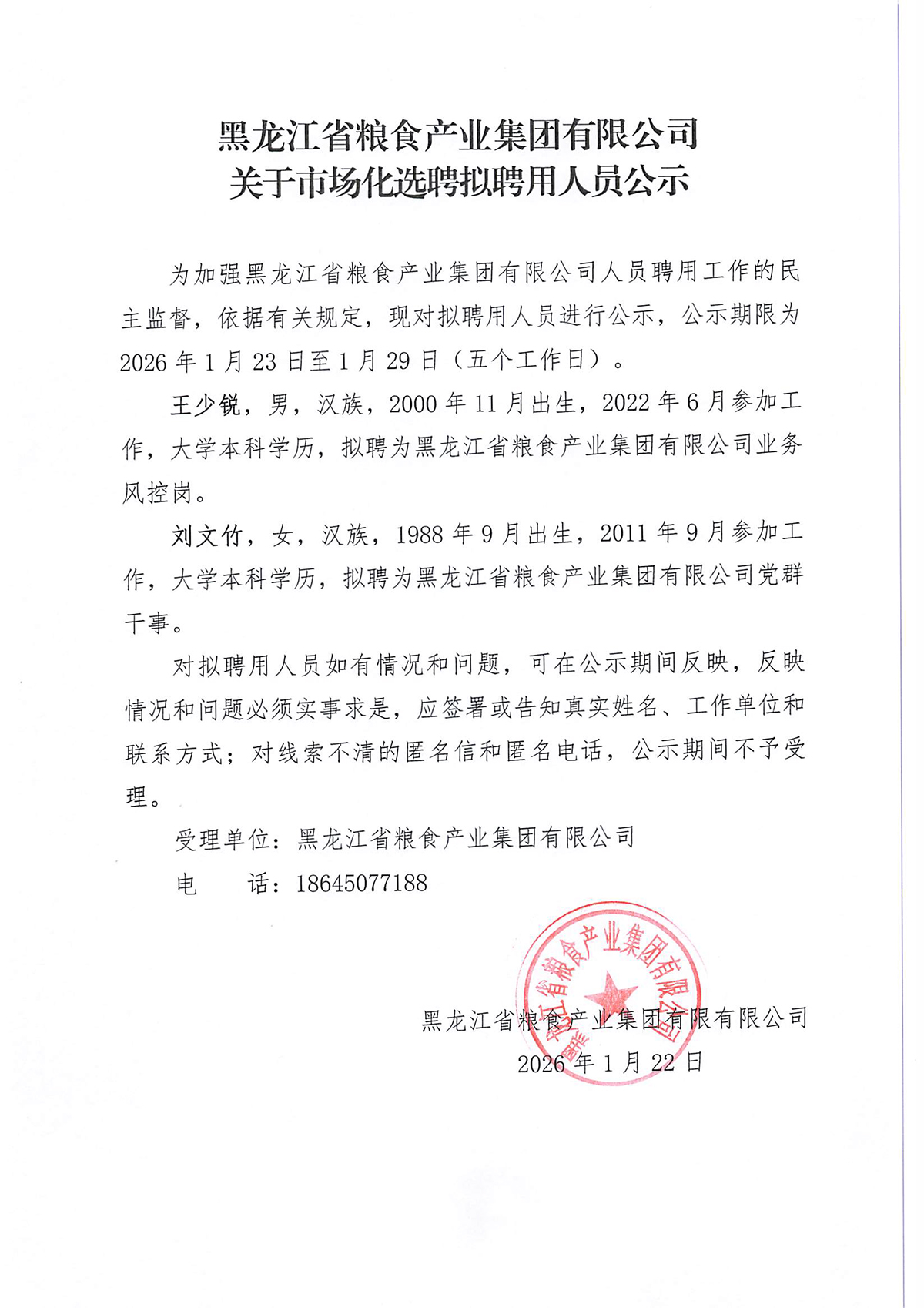 黑龙江省粮食产业集团有限公司关于市场化选聘拟聘用人员公示