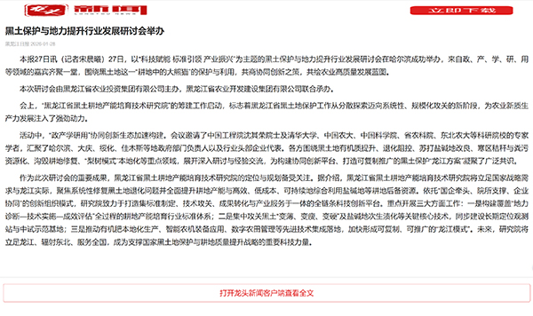 1月27日,由黑龙江省农业投资集团有限公司主办,黑龙江省农业开发建设集团有限公司联合承办的,以“科技赋能 标准引领 产业振兴”为主题的黑土保护与地力提升行业发展研讨会在哈尔滨市成功举办。会议的顺利召开,获得了社会各界的广泛关注,黑龙江省电视台、黑龙江日报等主流权威媒体,全程跟进报道,积极传递会议成果与行业声音。
